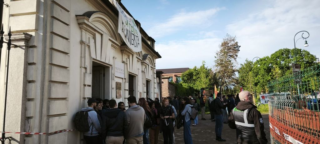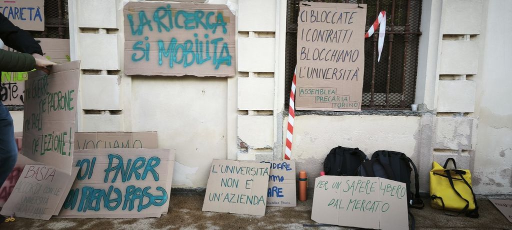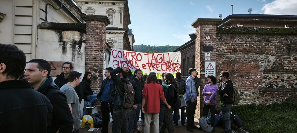 Non si fa lezione, questa mattina, al Castello del Valentino. La sede di architettura del Politecnico è stata bloccata dall'Assemblea Precaria Universitaria, col supporto di collettivi studenteschi come After Polis, Cambiare Rotta, Studenti Indipendenti, Cua e i settori scuola e università dei sindacati CGIL, USB e Cub. Docenti a contratto e dottorandi hanno scioperato, sospendendo le lezioni e la ricerca in protesta contro la Riforma Bernini e le spese pubbliche in guerra e armi.