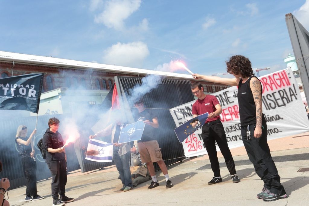 Qualche decina di manifestanti si è radunato questa mattina, mercoledì 21 maggio, all'ingresso delle OGR dove a breve sarà consegnato il premio all'innovazione all'ex premier e presidente della Bce Mario Draghi.