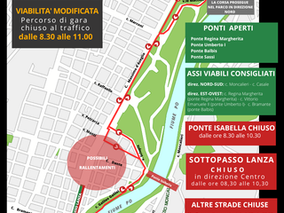 Il percorso della manifestazione podistica si svolgerà in parte nelle aree verdi in riva al Po, in parte sui corsi Massimo D’Azeglio, Sclopis, Galileo Galilei e vie limitrofe. Saranno chiusi, oltre al tracciato di gara, il sottopasso Lanza in direzione centro città ed il Ponte Isabella.