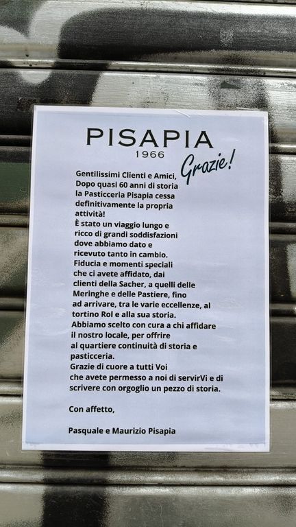San Salvario dice addio ad un "dolce" angolo: dopo quasi 60 anni di attività chiude la Torteria Bistrot Pisapia, di via Madama Cristina 11/1 a Torino.