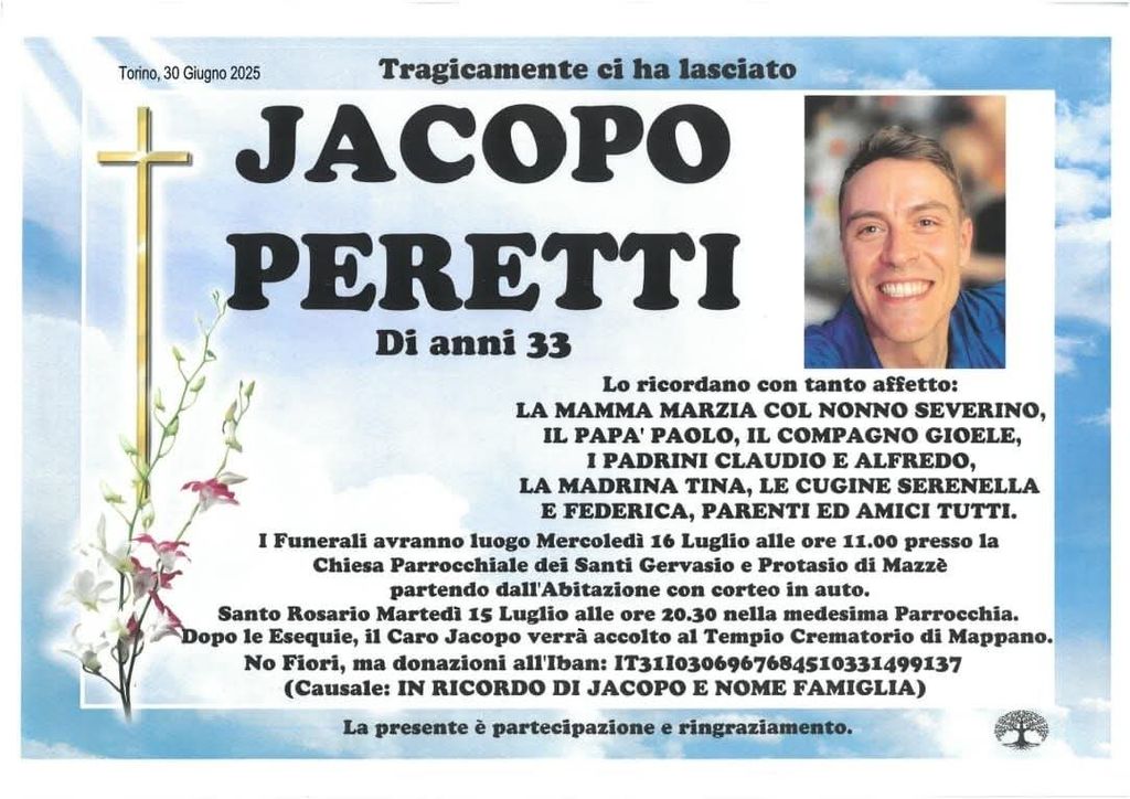 Tragedia di via Nizza, saranno celebrati mercoledì 16 luglio i funerali di Jacopo Peretti