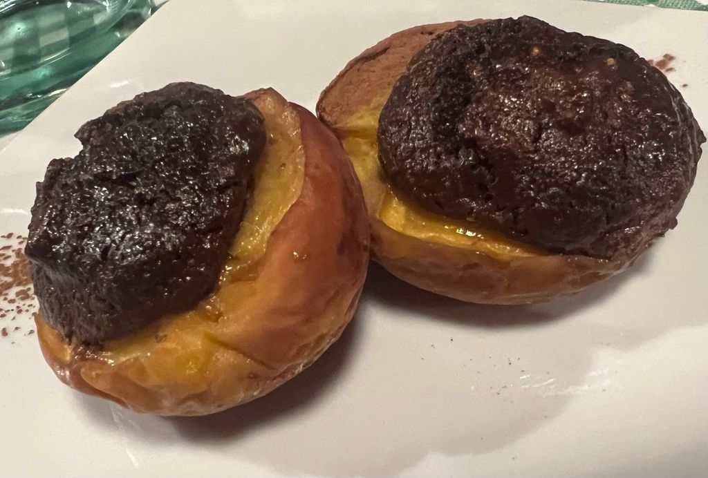 Lo stile di cucina degli Imbianchini già lo conosco. Ed è per questo che non mi faccio mancare il giro di antipasti: decise e dirette le Acciughe al verde col burro presentate su un crostino; ben riuscito il Tomino di Rivarolo al bagnetto rosso, nel quale la consistenza del formaggio ben si abbina alla dolce cremosità del peperone; secondo tradizione il Vitello tonnato; forse un po’ disturbata dalla fin troppo potente crema di tartufo estivo la delicata essenzialità della Salciccia di Bra. Indiscutibilmente persuasivi i Fusilloni al ragù di coniglio del Pinerolese, la cui perfetta cottura viene valorizzata appieno dal sapore intenso del coniglio. Qualche dubbio sull’amalgama dei Ravioli di magro, burro alla menta e agrumi, nel quale i diversi ingredienti sembrano un po’ perdersi nella loro identità specifica. Davvero super e al di là delle attese invece il piatto del giorno: un Pollo alla Marengo davvero capace di far ballare le papille gustative nell’immediato e di farsi ricordare anche una volta lasciato il locale. Chiudo con le mie prime Pesche ripiene di stagione: cotte “al dente”, dolci il giusto, con il ripieno del tutto in linea con la riuscita interpretazione di questo tradizionale dessert piemontese.