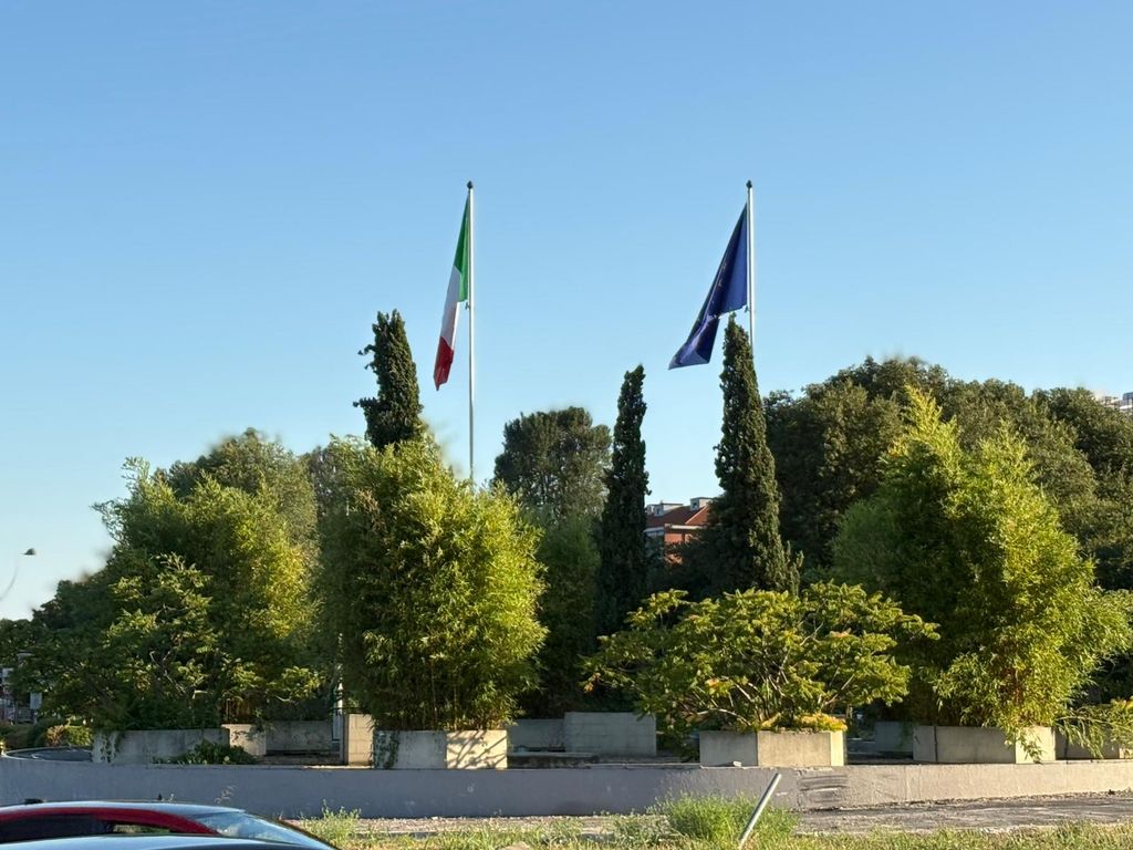 Due pennoni svettano al centro della rotonda, tra il verde curato dell’aiuola centrale, ma i vessilli issati - la bandiera Italiana e quella dell'Europa - sono logori, scoloriti, ridotti a brandelli dal tempo e dagli agenti atmosferici. Una visione che stride con il valore simbolico di questi emblemi.
