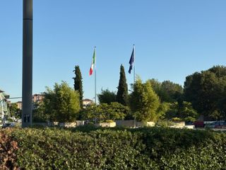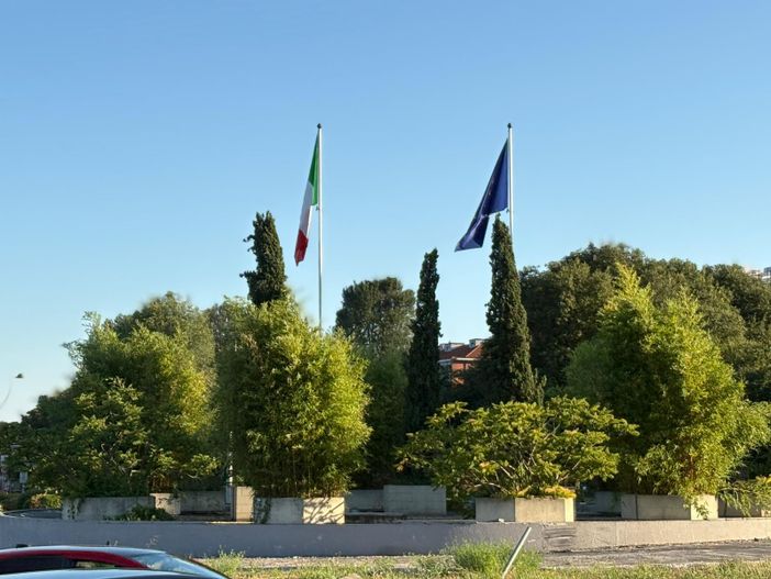 Due pennoni svettano al centro della rotonda, tra il verde curato dell’aiuola centrale, ma i vessilli issati - la bandiera Italiana e quella dell'Europa - sono logori, scoloriti, ridotti a brandelli dal tempo e dagli agenti atmosferici. Una visione che stride con il valore simbolico di questi emblemi.