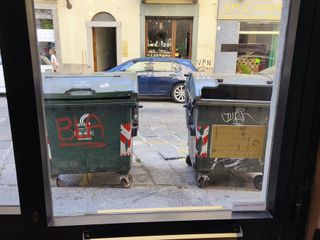 Di fronte alla profumeria ci sono due bidoni per la raccolta indifferenziata che, come riportato dalla negoziante, vengono riempiti spesso dal ristorante giapponese di fronte, anche di materiale organico. Pesce che, soprattutto, in estate, puzza a livelli insopportabili e attira nugoli di mosche anche a causa della rottura del coperchio di uno dei due cassonetti, che resta aperto.