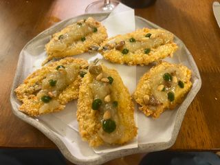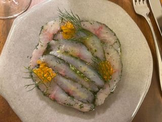 Dopo le scelte di rito, ecco arrivare in tavola un appetizer che respira di estate: una fresca Pappa al pomodoro dal sapore esplosivo. Quanto basta a far capire che la cena sta mettendosi sul binario giusto. E a confermarmelo immediatamente sono le Puntarelle in agrodolce il cui contrasto si armonizza sapientemente in un equilibrio pensato e realizzato con mano sapiente. Consapevole di essere probabilmente in minoranza, non posso che rilevare il “sottotono” dei Peperoni in bagna freida: ottimi i primi per consistenza e perfetta acidità, ma non valorizzati al meglio da una “bagna” che l’assenza di aglio priva della forza che mi attenderei. Quella che invece trovo, netta e coraggiosa, negli Spaghetti aglio, olio, peperoncino e bottarga di muggine: un piatto dalla cottura impeccabile e dal condimento capace di amalgamarsi perfettamente con la pasta. E la festa, tenendo sempre alto il livello della cucina, continua anche col secondo: un Salmerino al verde, uova di trota e tropea in agrodolce nel quale lo chef dà prova di saper gestire appieno anche la delicatezza di un pesce d’acqua dolce. Altrettanto intrigante la Frittura di alici in saor, dalla perfetta panatura e dal sapore intenso della ben nota marinatura veneta. Chiudo, con una piacevole Meringata di fragole al Vermouth rosso, una cena che - credo si sia capito! - è stata una delle più belle esperienze degli ultimi mesi. Peraltro accompagnata da un pane da urlo!