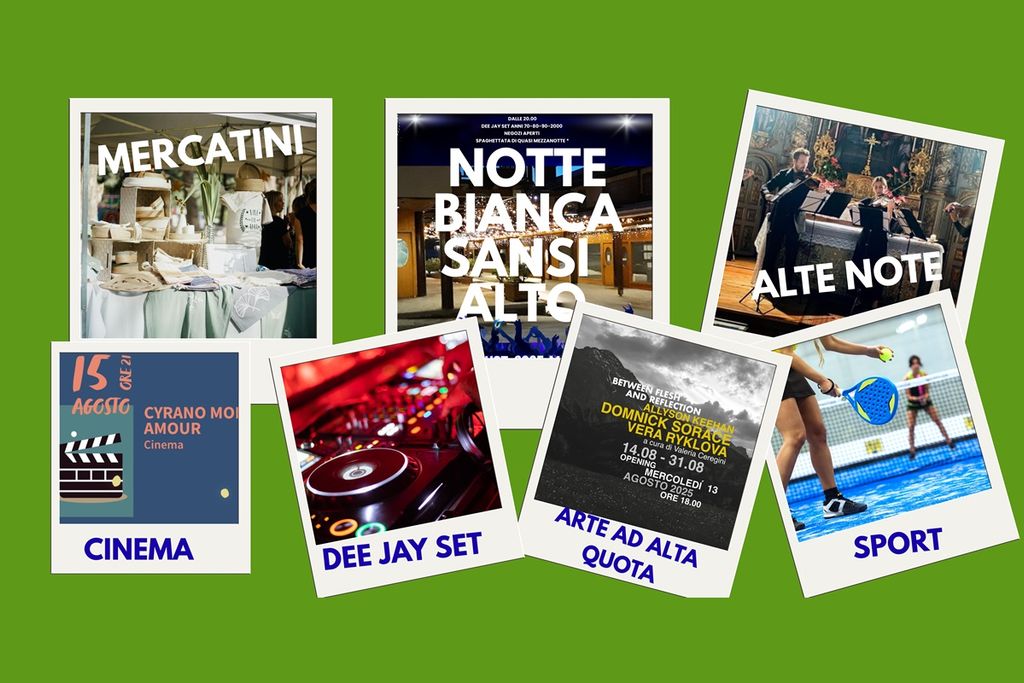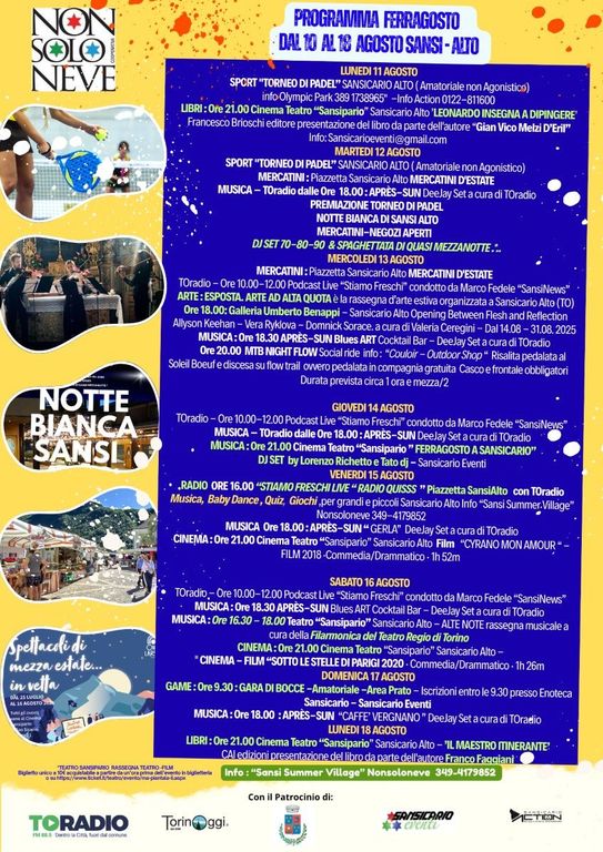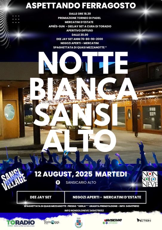 Tra il ricco programma che trovate allegato segnaliamo MERCATINI estivi martedì 12 e mercoledì 13 e MARTEDI 12 AGOSTO la “ NOTTE BIANCA ” di SansiAlto tra negozi aperti, musica, aperitivi , musica e una “Spaghettata di quasi Mezzanotte” ( info e prenotazioni 349 4179852 )