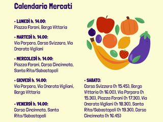 Il Calendario di agosto: lunedì: piazza Foroni, Borgo Vittoria; martedì: via Porpora, corso Svizzera (piazzetta Zamenhof), via Onorato Vigliani; mercoledì: piazza Foroni, corso Cincinnato, Santa Rita/Sebastopoli; giovedì: via Porpora, Borgo Vittoria, via Onorato Vigliani; venerdì: corso Cincinnato, Santa Rita/Sebastopoli. Durante la settimana il ritiro sarà alle 14, mentre il sabato: via Porpora ore 15:30, corso Svizzera (piazzetta Zamenhof) ore 15:45, corso Cincinnato ore 16:45; Borgo Vittoria ore 16, piazza Foroni ore 17:30; via Onorato Vigliani ore 18:30, Santa Rita/Sebastopoli ore 19:30, Porta Palazzo ore 19:30.