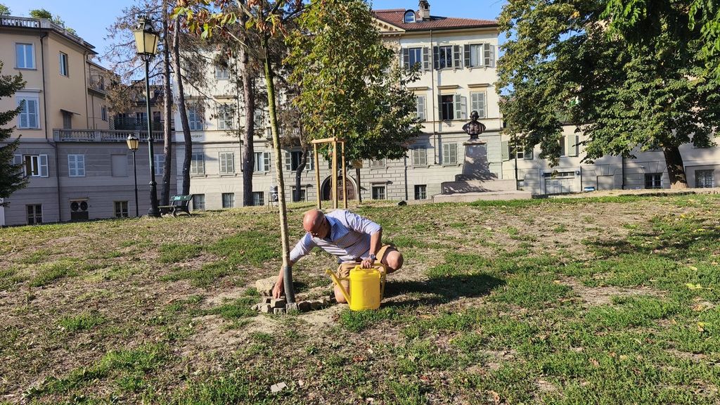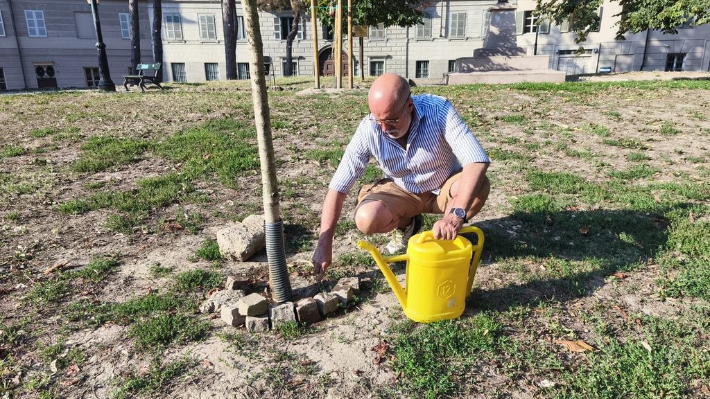 "Vengo circa ogni due giorni ed è una cosa che facevo anche gli anni scorsi: questo l'ho salvato io - dice indicando un albero nel giardino Cavour -. Il Comune viene a innaffiare le piante in vaso all'ingresso della piazza, ma non gli alberi nel prato". Se a luglio il tempo è stato clemente, con temperatura più basse, cielo coperto e alcuni giorni di pioggia, a giugno e agosto la siccità potrebbe avere la meglio su questi giovani alberi. Nell'estate del 2022 le piante vittime del caldo estremo furono centinaia, e il conto sale a 2500 a causa dello stress idrico dei mesi successivi.