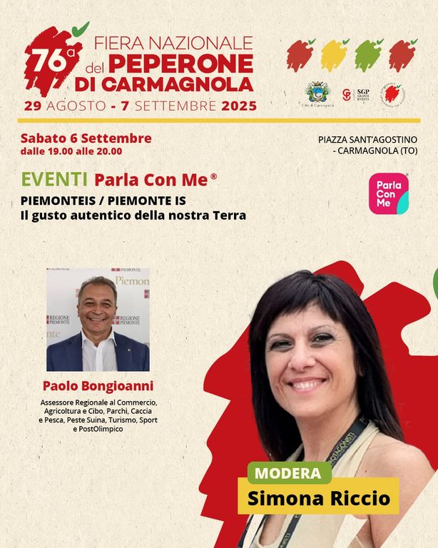 La 76ª Fiera Nazionale del Peperone di Carmagnola (29 agosto – 7 settembre 2025) ospiterà tre serate speciali del format Parla con Me Ⓡ, ideato e condotto da Simona Riccio (Digital Marketing Expert, Social Media Manager, LinkedIn Top Voice Italia, Founder Parla con Me Ⓡ).