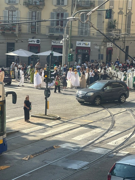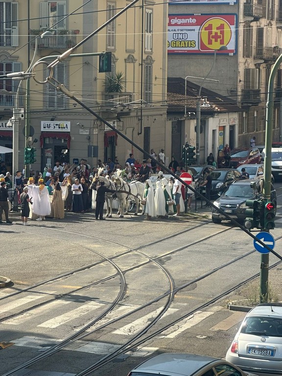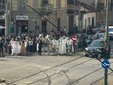 Un corteo religioso, probabilmente un matrimonio, con tanto di carrozza e cavalli ha bloccato nella mattina di oggi, venerdì 12 settembre, corso Giulio Cesare. Come si vede dalle immagini una vettura bianca addobbata a festa, trainata da due equini, ha sfilato per le vie di Barriera di Milano scortata da un gruppo di oltre cinquanta persone.