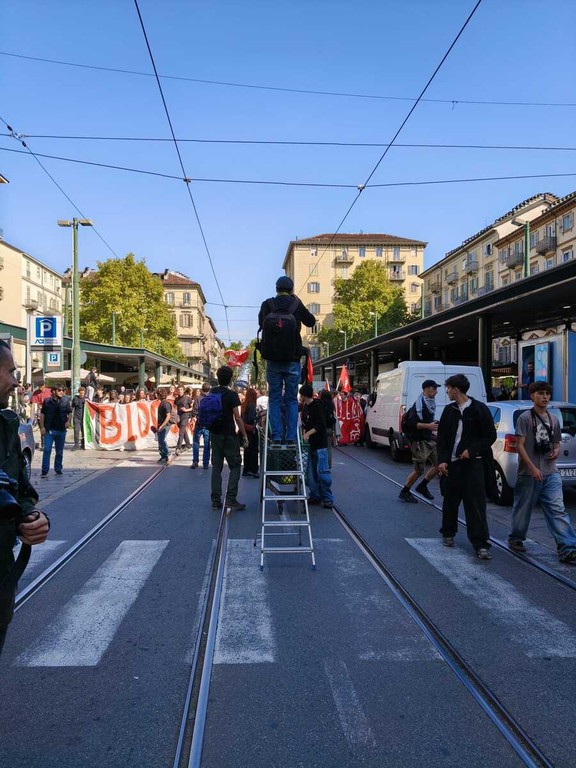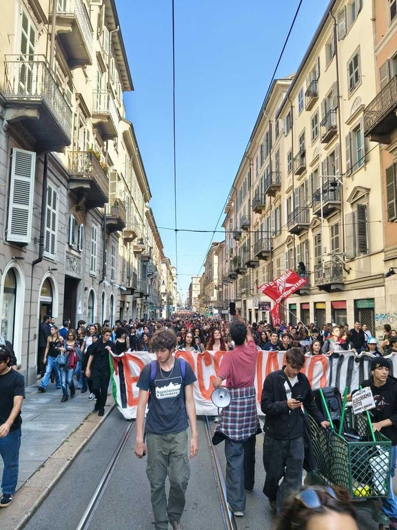 Il concentramento è alle 11 davanti a Palazzo Nuovo, da dove è partito il nuovo corteo: l'obiettivo è raggiungere tutti gli altri atenei di Torino. Una parte dei manifestanti si muove in bicicletta, mentre la restante parte a piedi. Oltre agli universitari sono presenti anche gli studenti delle scuole occupate, a partire dal liceo Einstein. I ragazzi e le ragazze dal megafono hanno urlato:"Angurie si, Meloni no".