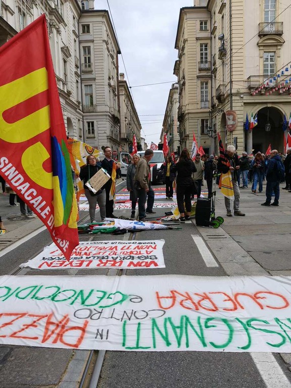 "Questo governo - hanno urlato dal megafono sul carro di "Torino per Gaza" - ha provato a riempirci di vergogna: tocca ai lavoratori rimandare questo sistema marcio nella pattumiera". Un pensiero anche ai lavoratori di Amazon, che da stamattina stanno bloccando il magazzino di Brandizzo.