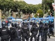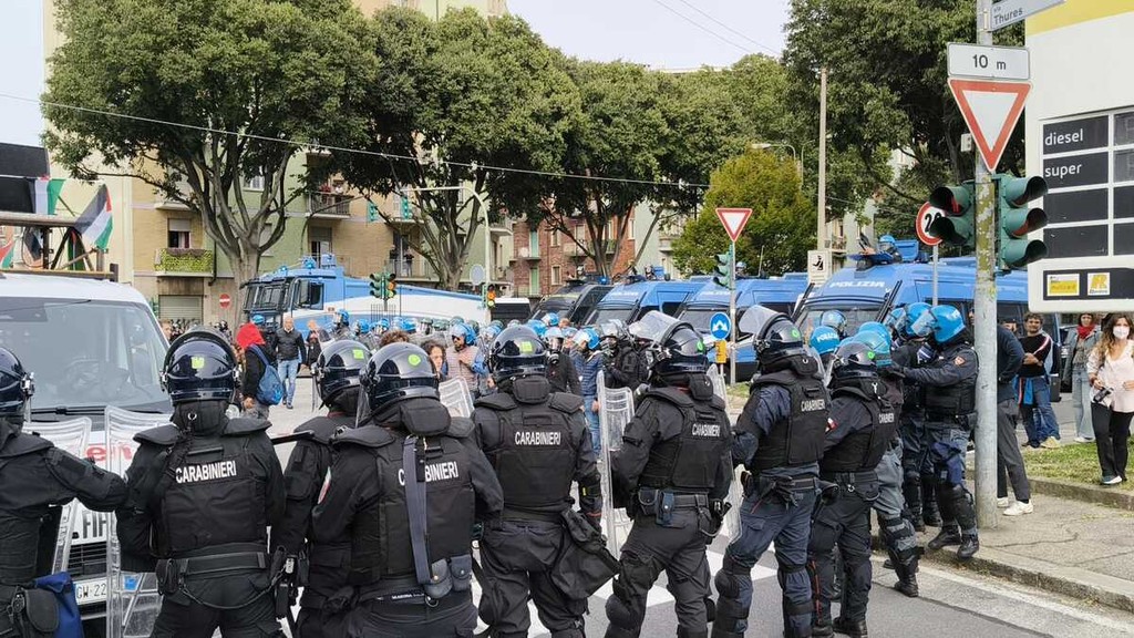 La Polizia ed i Carabinieri in tenuta antisommossa, con gli scudi e le camionette con idrante, ha bloccato i manifestanti che stavano rientrando pacificamente verso il centro città. Il cordone ha bloccato completamente i Pro Pal: al momento si sono registrati solo degli scontri verbali.