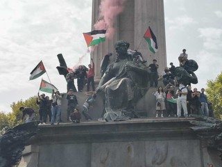 Lo spezzone sociale ha raggiunto largo Vittorio. Sono quasi un centinaio i ragazzi e le ragazze arrampicati sul monumento a Vittorio Emanuele II, posto al centro della piazza, che sventolano le bandiere della Palestina e hanno acceso i fumogeni.