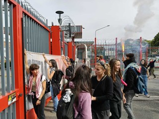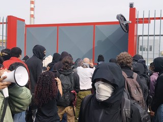 E dai megafoni i manifestanti, molti con il volto coperto da sciarpe ed occhiali, hanno urlato: "Dietro questo filo spinato viene dato vita ad ordigni che uccidono le persone: quindi bloccare qui, vuol dire bloccare la produzione di questa m...a".