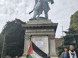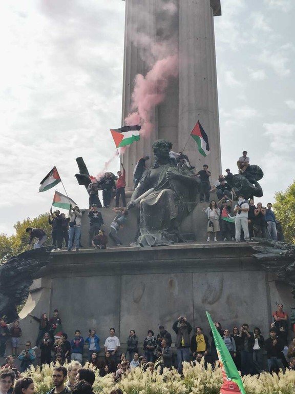 Lo spezzone sociale ha raggiunto largo Vittorio. Sono quasi un centinaio i ragazzi e le ragazze arrampicati sul monumento a Vittorio Emanuele II, posto al centro della piazza, che sventolano le bandiere della Palestina e hanno acceso i fumogeni.