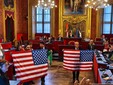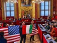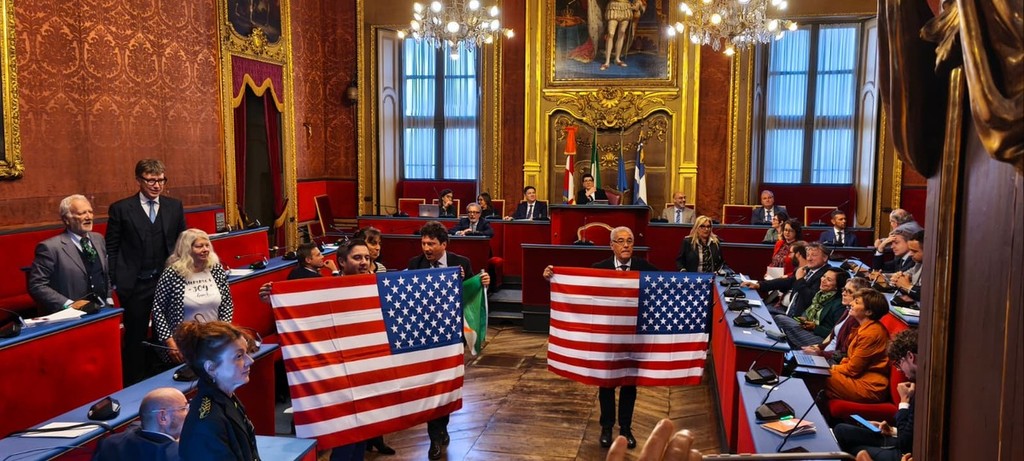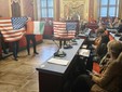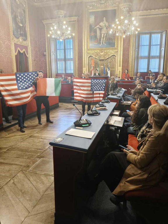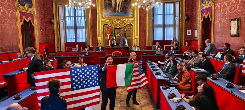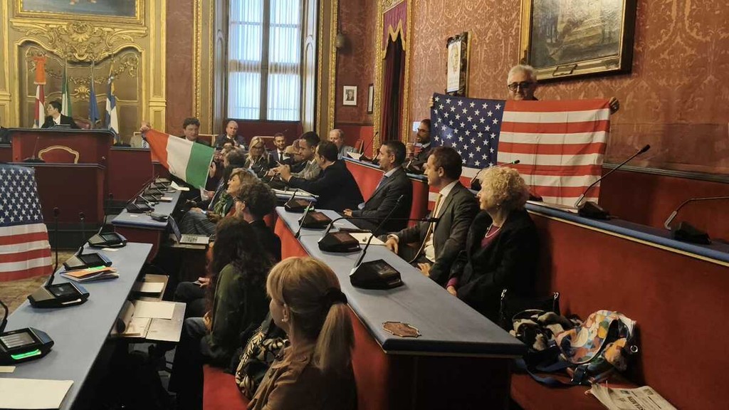 "Guerra" delle bandiere in Sala Rossa, tra Palestina e vessillo USA [VIDEO e FOTO]