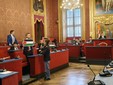 Il centrodestra - insieme al Radicale Viale - ha esposto il tricolore, la bandiera americana e di Israele. Replica del M5S