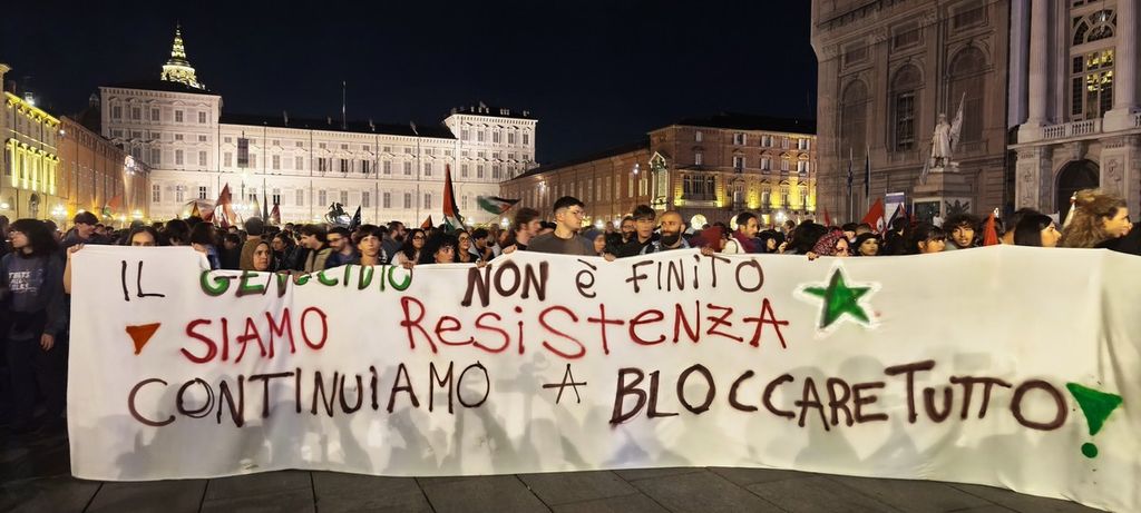 Il ritrovo in piazza Castello nonostante il divieto della Questura. La marcia per le vie del centro, il ballo sulle note di "Bella Ciao",i vessilli della Palestina e il supporto dei residenti che rumoreggiano con pentole e coperchi