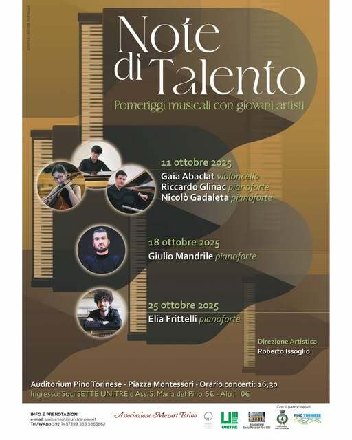 Nel mese di ottobre, a Pino Torinese, arriva “Note di Talento”, la rassegna organizzata dall’Associazione Mozart Torino in collaborazione con l’Unitre Pino Torinese e l’Associazione Santa Maria del Pino, con il patrocinio del Comune di Pino Torinese. La direzione artistica è affidata al Maestro Roberto Issoglio