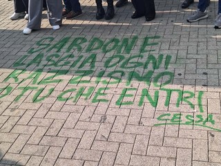 Una contestazione pacifica, ma costante, durata per tutto il tempo del presidio. Sul marciapiede, infine, sono apparse anche scritte realizzate con bombolette spray: frasi come "Sardone la tua ricchezza è la tua povertà" o "Odio la Lega" hanno colorato l'asfalto a fine mattinata.