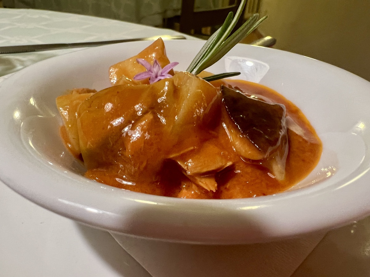 ecco i Tajarin della" Via del Sale", cotti come si deve e perfettamente amalgamati nel loro insieme. E mentre mi delizio con questi ultimi, si sente chiaramente arrivare dalla cucina lo sfrigolio nell’olio bollente di quel che sarà l’ingrediente assoluto del piatto successivo: