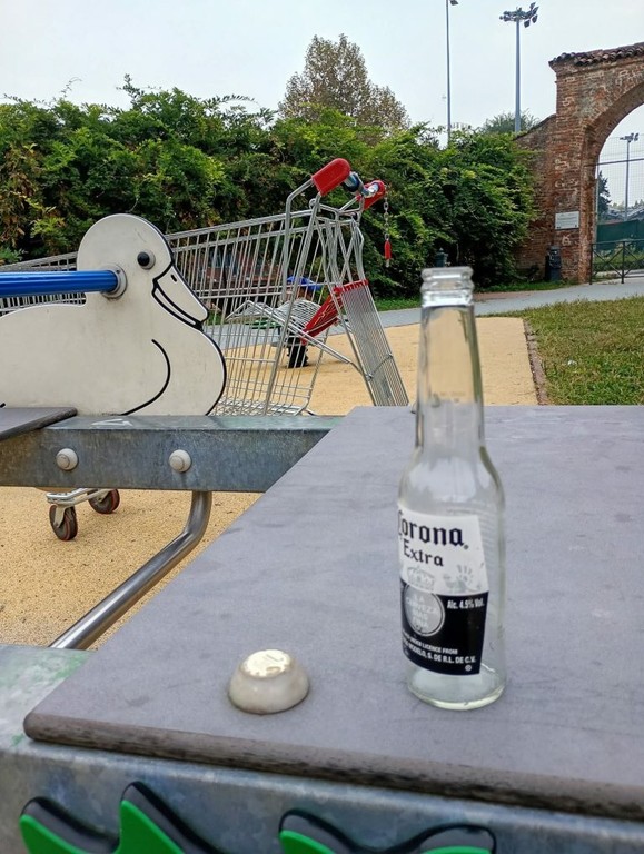 Vandali di nuovo in azione a Moncalieri, in un luogo già 'visitato' in un recente passato. Bottiglie di birra lasciate dappertutto, un tappettino anti infortunio per i bambini rovinato, persino un carrello della spesa abbandonato: questo il desolante quadro che si trovava nel Giardino della Luna, fatto nuovamente oggetto di comportamenti incivili.