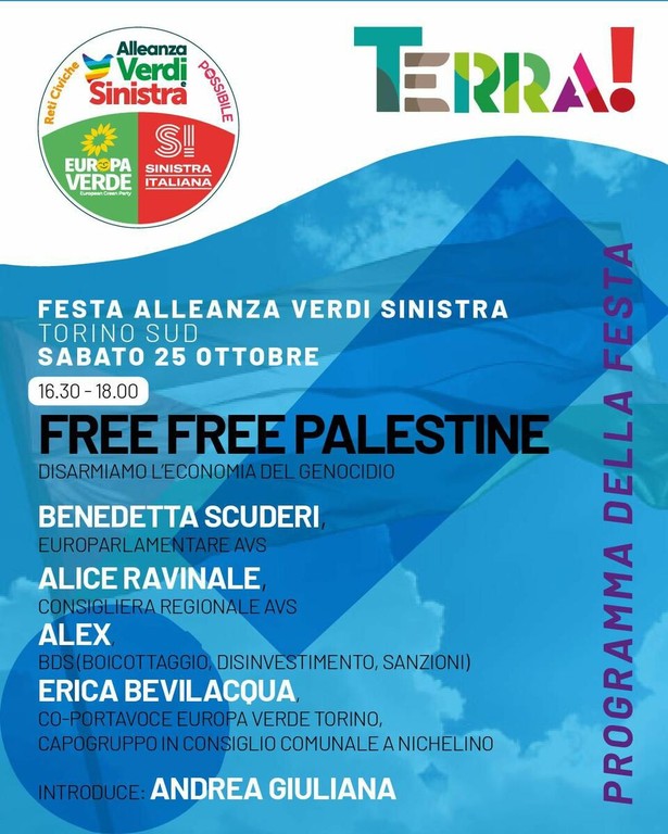 alle 16.30 l’incontro “Free Free Palestine – Disarmiamo l’economia del genocidio”, con Benedetta Scuderi (europarlamentare AVS), Alice Ravinale (consigliera regionale AVS), Erica Bevilacqua (Europa Verde Torino) e un intervento del movimento BDS.