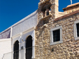 Pochi metri più in alto, una piazzetta si apre all’improvviso: tavoli di legno, un muro bianco con una sola parola scritta in nero — “Mediterraneo”. È impossibile non pensare al film di Gabriele Salvatores, girato qui e premiato con l’Oscar. Una storia di uomini sospesi tra la guerra e una terra remota che li disarma, prima ancora di accoglierli. Quella scritta non è decorazione: è memoria sedimentata, più incisiva di qualunque brochure. Attorno, muri scrostati e facciate restaurate convivono senza spiegazioni; la scena è vuota e viva allo stesso tempo, come se qualcuno dovesse comparire da un momento all’altro. Poco distante si trova la Santrapeia School, fondata nel 1903 della diaspora greca che è uno degli edifici simbolo di Kastellorizo. La sua architettura neoclassica, con colonne e timpano, testimonia il periodo di grande sviluppo a inizio Novecento, quando cultura e commercio fiorivano grazie alla posizione strategica e al momento storico. Oggi l’edificio resta un punto di riferimento solo identitario per gli abitanti.