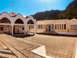 Pochi metri più in alto, una piazzetta si apre all’improvviso: tavoli di legno, un muro bianco con una sola parola scritta in nero — “Mediterraneo”. È impossibile non pensare al film di Gabriele Salvatores, girato qui e premiato con l’Oscar. Una storia di uomini sospesi tra la guerra e una terra remota che li disarma, prima ancora di accoglierli. Quella scritta non è decorazione: è memoria sedimentata, più incisiva di qualunque brochure. Attorno, muri scrostati e facciate restaurate convivono senza spiegazioni; la scena è vuota e viva allo stesso tempo, come se qualcuno dovesse comparire da un momento all’altro. Poco distante si trova la Santrapeia School, fondata nel 1903 della diaspora greca che è uno degli edifici simbolo di Kastellorizo. La sua architettura neoclassica, con colonne e timpano, testimonia il periodo di grande sviluppo a inizio Novecento, quando cultura e commercio fiorivano grazie alla posizione strategica e al momento storico. Oggi l’edificio resta un punto di riferimento solo identitario per gli abitanti.
