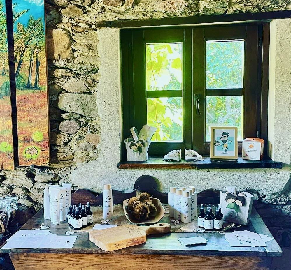 Trasformare la castanicoltura in lavoro non stagionale è la sfida che Marco ha messo in campo: “Ovviamente – ci spiega – per noi resta decisiva la vendita delle castagne per gli eventi autunnali che hanno per protagonista questo frutto della terra: sagre, castagnate, fiere di paese, mercatini, manifestazioni enogastronomiche. La cura dei castagneti però richiede un lavoro molto impegnativo e sarebbe limitante pensare la castagna come esclusivamente legata a questa stagione. Così, in un’ottica di destagionalizzazione, abbiamo trovato il mulino giusto per macinare le castagne e trasformarle in farina. Ed è da quest’ultima che prendono vita, oltre che biscotti e torte, diverse linee di pasta secca: tagliatelle, gnocchi e penne. Abbiamo inoltre deciso di puntare anche su creme spalmabili, castagne sciroppate, senza dimenticare una linea cosmetica alle foglie di castagno e una birra alle castagne nata in collaborazione col birrificio Grado Plato di Chieri”.