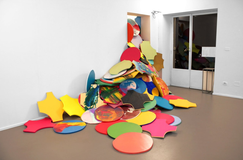 L’installazione si compone di dieci elementi metallici di 50 cm di diametro, sospesi e dipinti a mano. Alcuni fluttuano nello spazio mossi da correnti d’aria, altri si raccolgono in “ammassi” compatti, come se dialogassero tra loro. Le “monadi” alternano momenti di sospensione e densità, suggerendo un’architettura invisibile di relazioni e armonie tra singoli autonomi ma interconnessi.
