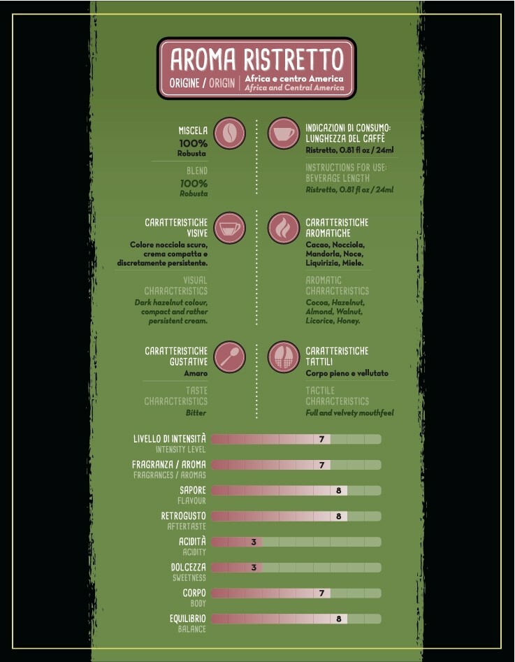 Le informazioni stampate sul pack sono davvero complete e indicano il paese d’origine del caffè, il tipo di miscela, le caratteristiche visive, aromatiche, gustative e tattili, ma anche la lunghezza del caffè, espressa in millilitri, consigliata a seconda del tipo di caffè . Sono altresì indicati, su scala 1 a 10, il livello di intensità, la fragranza, il sapore, il retrogusto, l’acidità, la dolcezza, il corpo e l’equilibrio. Dati che aiutano il consumatore nella scelta della miscela che più si adatta alle personali esigenze di gusto.
