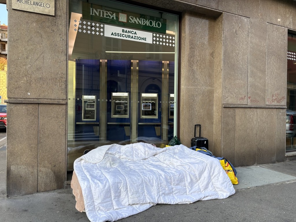 Piazza Nizza, quartiere San Salvario. Ogni mattina i passanti lo vedono lì, accampato sul marciapiede della filiale Intesa Sanpaolo. Una coperta, qualche sacchetto, un materasso. Di certo non passa inosservato, vuoi anche per la presenza della fermata della metro Nizza. È diventato, suo malgrado, il volto visibile di un disagio che si sta estendendo in tutta la città: quello dei senza fissa dimora.