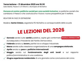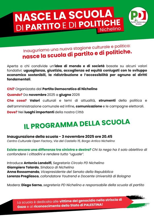 Una scuola che parte da un assunto: sarà aperta a tutti coloro che pensavo che la società debba essere costruita e sviluppata sulla base di alcuni principi e valori fondamentali e non altri, come: uguaglianza, giustizia, accoglienza ed equità coniugati con lo sviluppo economico, ridistribuzione e accessibilità per ognuno ai diritti fondamentali. "Una scuola “di parte” e quindi di partito, che si svilupperà con incontri teorici, culturali e esperienziali, sui temi di attualità e con lo studio di strumenti pratici politici e amministrativi. Le basi per un buon impegno politico sono: una buona informazione, una profonda condivisione dei valori e un’ottima conoscenza degli strumenti", come ha spiegato il referente di questa iniziativa, l'ex consigliere regionale e nichelinese doc Diego Sarno. Insieme a lui Santo Cistaro con il coordinamento della segreteria cittadina del PD e il Segretario Antonio Landolfi.