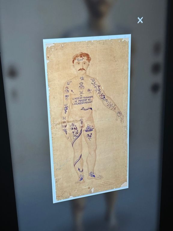 La collezione comprende riproduzioni di corpi tatuati di persone vissute tra la fine dell’800 e i primi decenni del 900, quasi tutte carcerate tra Torino e Alessandria. Era una delle aree di interesse di Lombroso, convinto che incisioni e disegni sulla pelle potessero essere indicatori di tendenze criminali e istinti primitivi. Sono dieci le figure rappresentate, ma si sale a venti contando anche i particolari di corpi non completi.