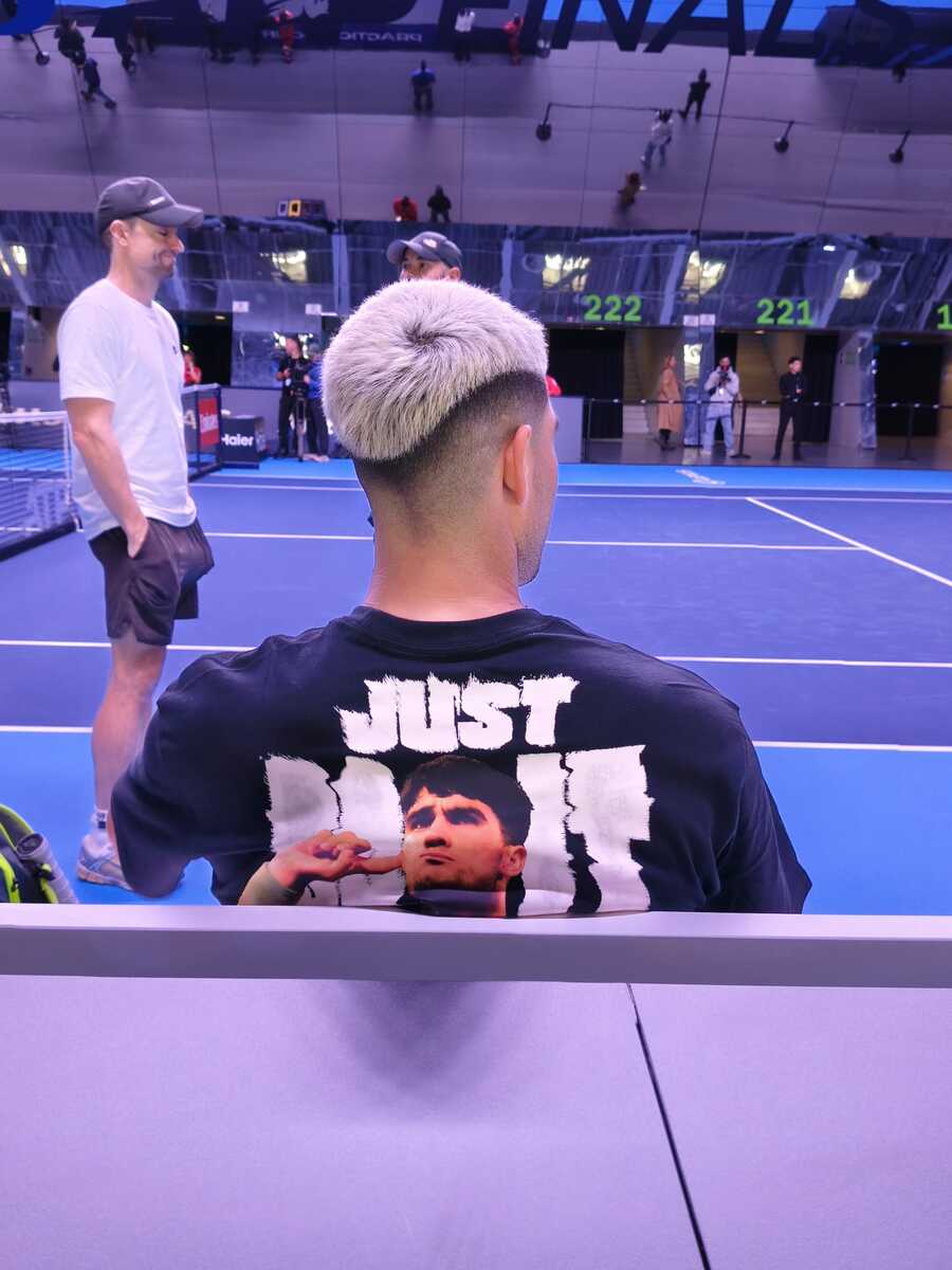 Sulla panchina dello spagnolo, il coach Juan Carlos Ferrero. E durante la partita, Alcaraz ha deciso di sfoggiare una maglietta con la sua immagine sulla schiena. Un allenamento comunque segnato da scambi potenti, sotto l'occhio delle telecamere.