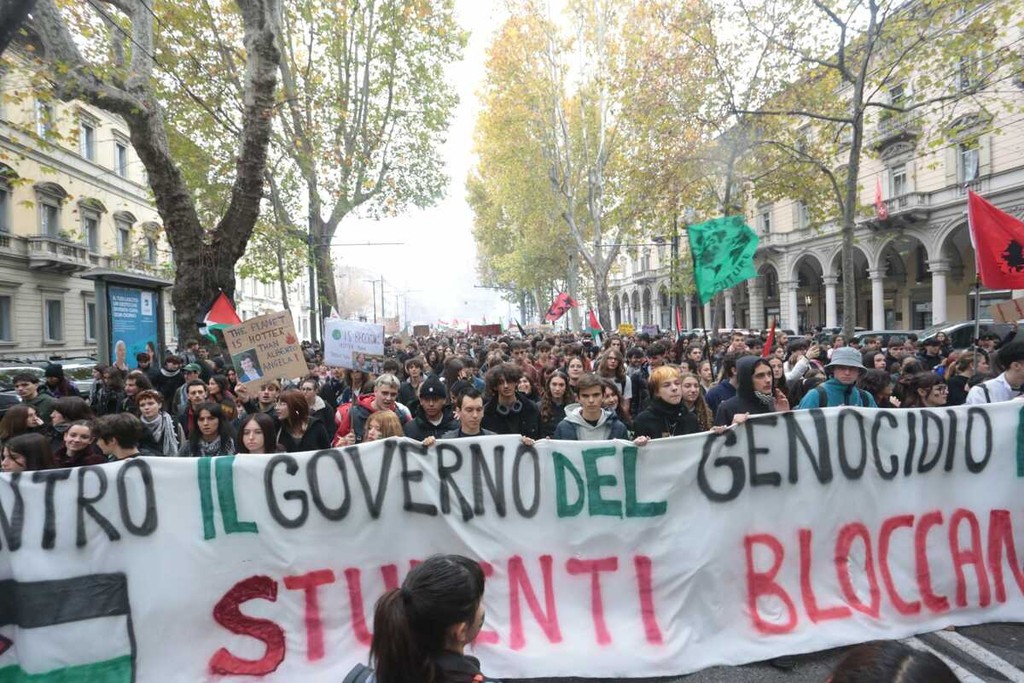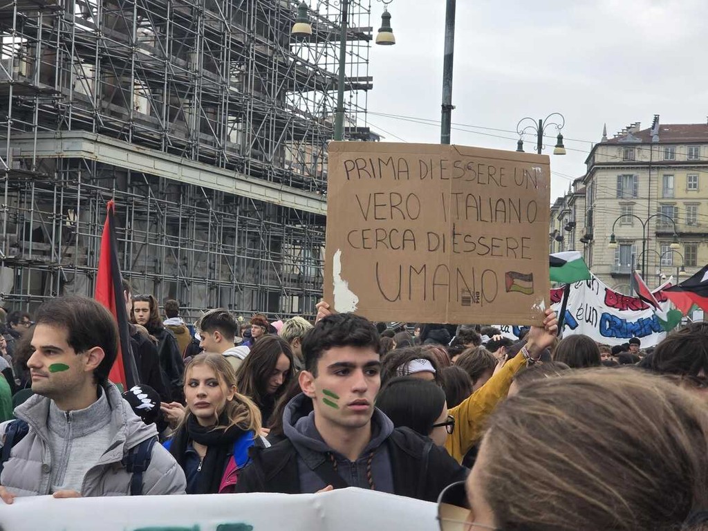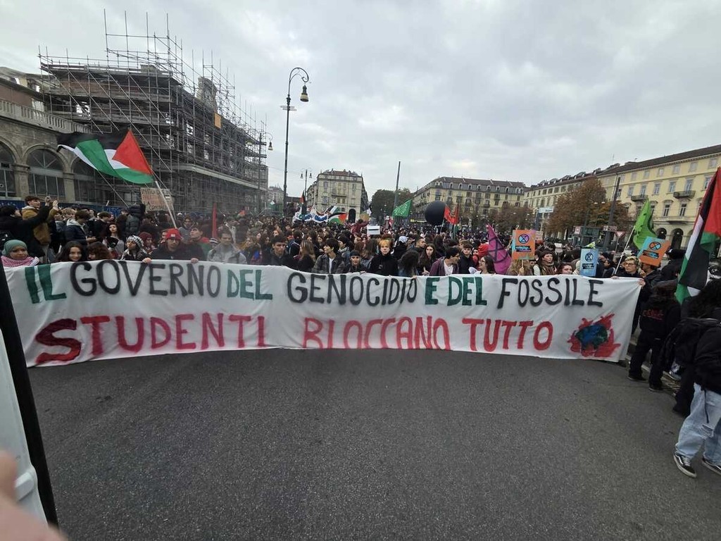 Il corteo, composto da migliaia di partecipanti, è partito intorno alle ore 10,30, costeggiando la stazione Torino Porta Susa su via Bolzano, in direzione Corso Vittorio Emanuele II. In testa uno striscione con scritto: "Il governo del genocidio e del fossile. Gli studenti bloccano tutto".