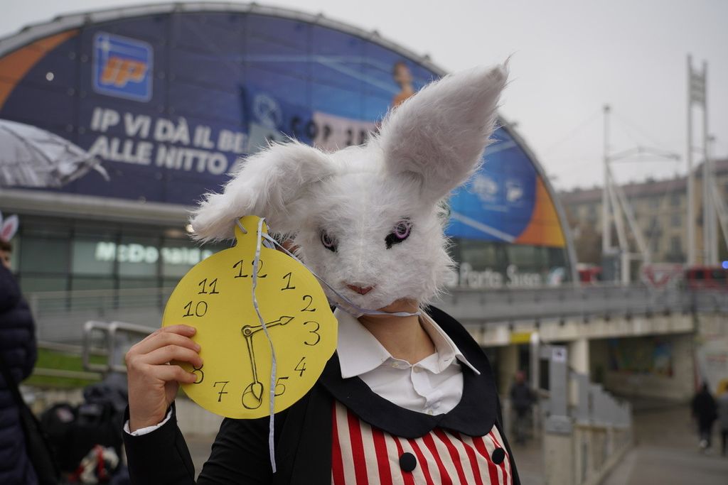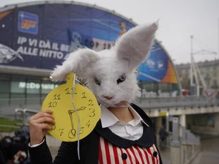Sul marciapiede antistante, diverse persone si sono radunate in presidio per parlare con i passanti, mentre tra loro si aggirava una persona travestita da Bianconiglio, che nervosamente guardava il suo orologio e borbottava "È tardi". Un modo ironico per enfatizzare l'urgenza di politiche climatiche più incisive, proprio nei giorni in cui a Belem, la capitale dell'Amazzonia, si svolge la COP30, il vertice annuale sul clima.