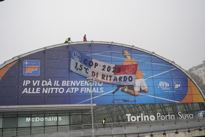 Questa mattina, dopo essersi arrampicate con imbraghi e caschetti sul tetto della stazione di Porta Susa, alcune attivisti di Extinction Rebellion hanno calato sulla facciata di vetro sopra l’ingresso principale un grande striscione con lo slogan: "COP2025: 1.5°C DI RITARDO".