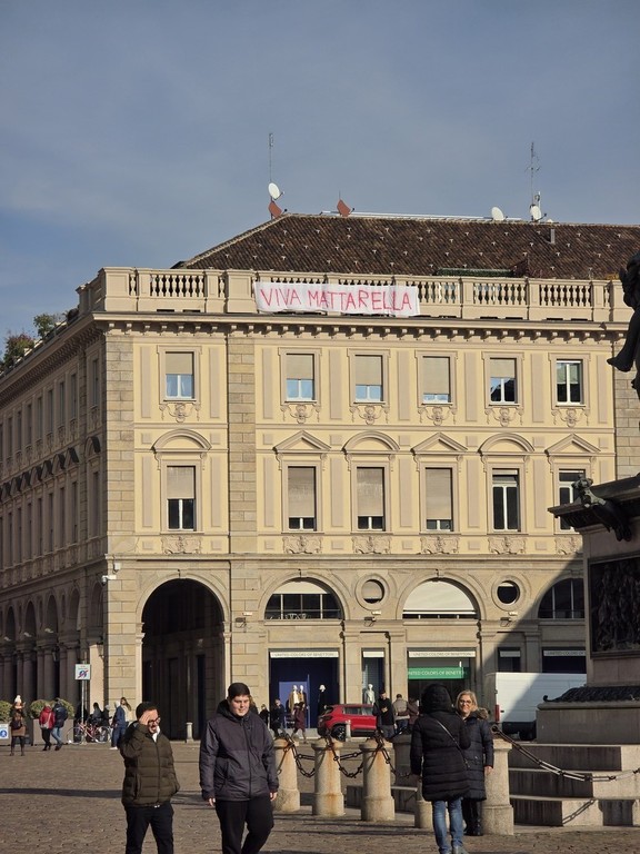 Nuovo striscione a sostegno del presidente della Repubblica in piazza San Carlo. Nelle scorse ore è ricomparso, appeso al quarto piano dell’edificio che fa angolo con via Roma, il lenzuolo bianco con su scritto "Viva Mattarella".