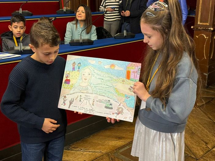 Durante la cerimonia, i bambini hanno illustrato il loro elaborato grafico e hanno recitato una poesia dedicata alla pace, condividendo il senso e la forza del messaggio che hanno voluto rappresentare.