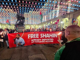 Oggi un nuovo presidio di solidarietà, questa volta davanti al comune. Qualche centinaio si sono radunati davanti a Palazzo di Città con candele, bandiere della Palestina e con i cartelli con la foto di Shahin. Srotolato uno striscione con scritto "Nobody deported for supporting Palestine".