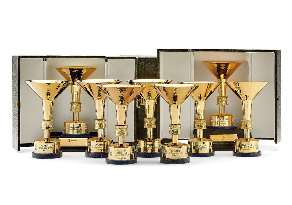 La storia del calcio italiano viene narrata attraverso le maglie delle grandi partite: quella di Clarence Seedorf, con il Milan per la finale di Champions League 2007 (lotto 109, stima 5.000-7.500 euro), quella del Torino di Martin Vásquez, indossata in occasione della finale di ritorno di Coppa Uefa Ajax vs Torino (0-0) del 13 maggio 1992 (lotto 281, stima 2.500-3.500 euro) e andando ancora più indietro nel tempo quella di Nazzareno Canuti, indossata nella finale di Coppa Italia 1977-1978 con l’Inter (lotto 346, stima 7.500-10.000 euro). Curioso il lotto di nove coppe in miniatura per la Juventus Campione d’Italia dal 2011 al 2020 (lotto 57, stima 4.000-5.000 euro).