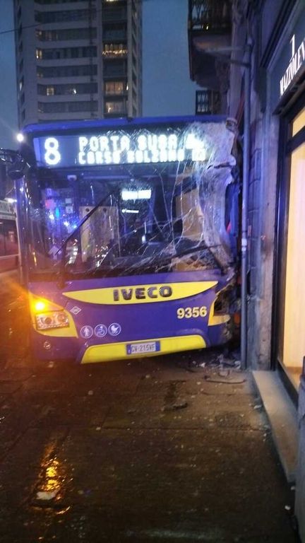 Incidente in via Cernaia, angolo piazza Solferino, dove un autobus si è schiantato contro la vetrina di un negozio.