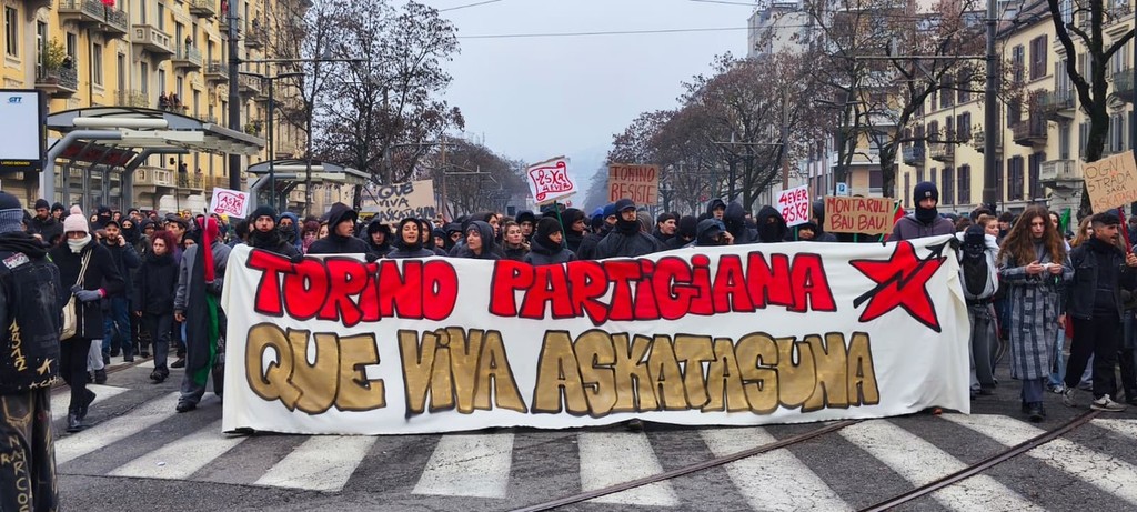 "Inizia questa giornata di lotta": non si arrende Askatasuna e scende in strada. Sono in tanti a sostegno del centro sociale chiuso giovedì scorso, dalle 14.30 di fronte a Palazzo Nuovo: migliaia di militanti, sostenitori e simpatizzanti e moltissime camionette della Polizia e agenti in tenuta antisommossa a chiudere alcune strade.