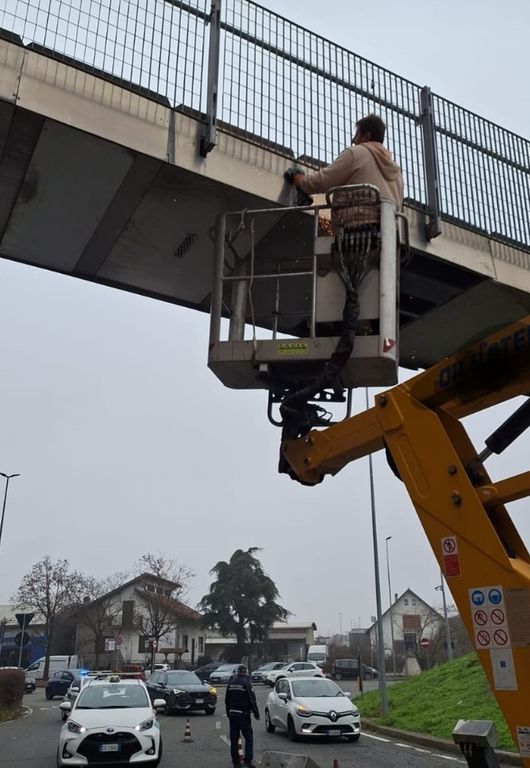 Immediatamente informata dell'accaduto, la Polizia locale giungeva sul posto con due volanti, constatando che una parte del pannello sottostante era precipitata a terra: l'area veniva quindi isolata, prima di procedere al ripristino e alla successiva messa in sicurezza della passerella. Ottenuto l'ok sull'agibilità della struttura da parte dei tecnici del Comune, intorno alle ore 11 veniva ripristinata la normale circolazione stradale.
