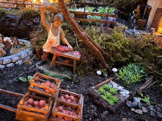 Alcune statuine prendono vita. Sono meccanizzate, animate nei gesti quotidiani: il fornaio, la pescivendola, il vasaio, l’uomo che prepara la polenta. Arrivano da una donazione della signora Antonella, così come altre figure che negli anni hanno arricchito la scena. C’è anche una statua in legno del 1900, silenziosa e preziosa, che porta con sé il peso del tempo.