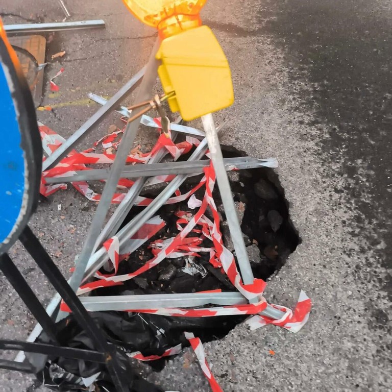 Tuttavia, nel corso dei giorni successivi la segnaletica è stata abbattuta, con i cavalletti sparsi lungo la strada, creando ulteriori rischi per la viabilità. Frammenti di autovetture sono ancora presenti sull’asfalto e sul marciapiede, a testimonianza dei piccoli incidenti verificatisi a causa della voragine non ancora riparata.